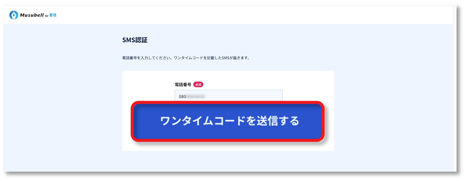 ②SMSを受信したい電話番号を入力し、[ワンタイムコードを送信する]を押します。
