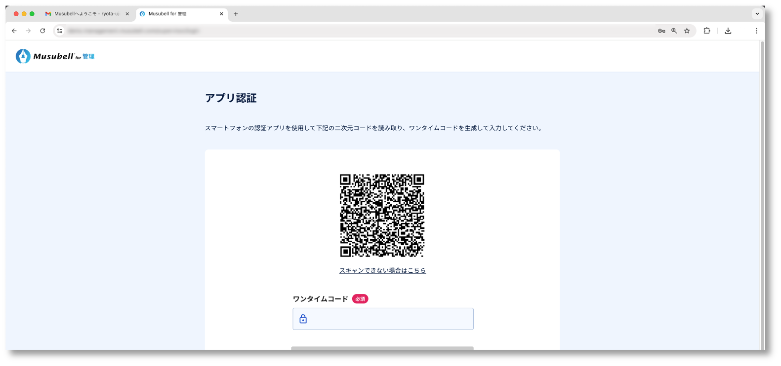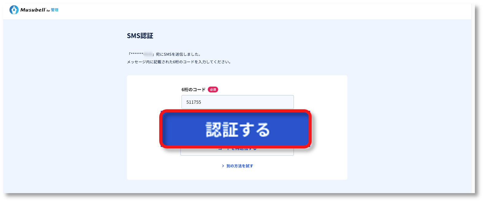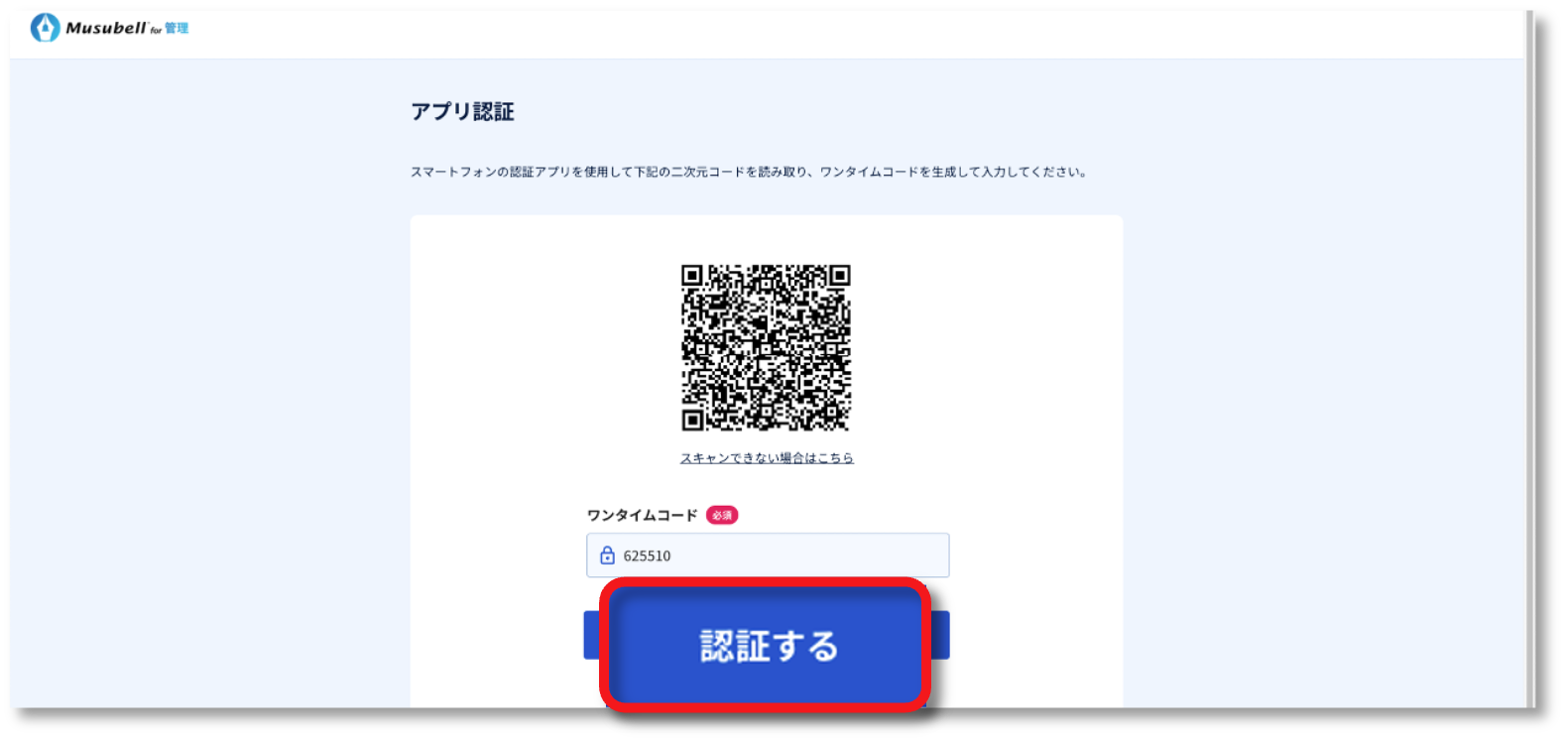 ④Musubell画面に6桁のコードを入力し、[認証する]を押します。