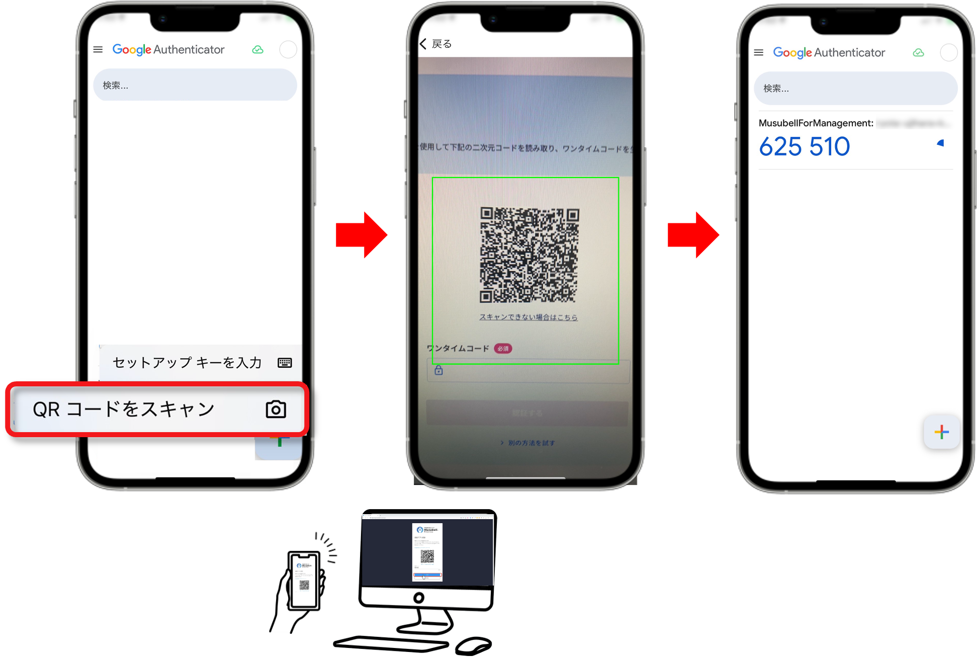 ③QRコードが表示されます。 スマホにダウンロードした認証アプリを開き、[QRコードをスキャン]を押すと カメラが起動しますので、表示されたQRコードを写します。