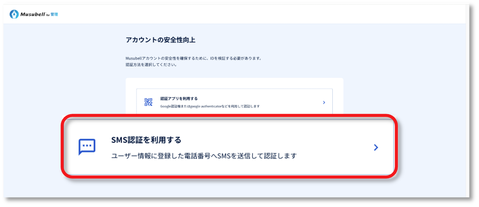 Musubellでは、ログイン時にメールアドレスとパスワードだけでなく、スマホに表示されたコードの入力を義務付ける(=2要素認証を導入する)ことでセキュリティ性を高めています。