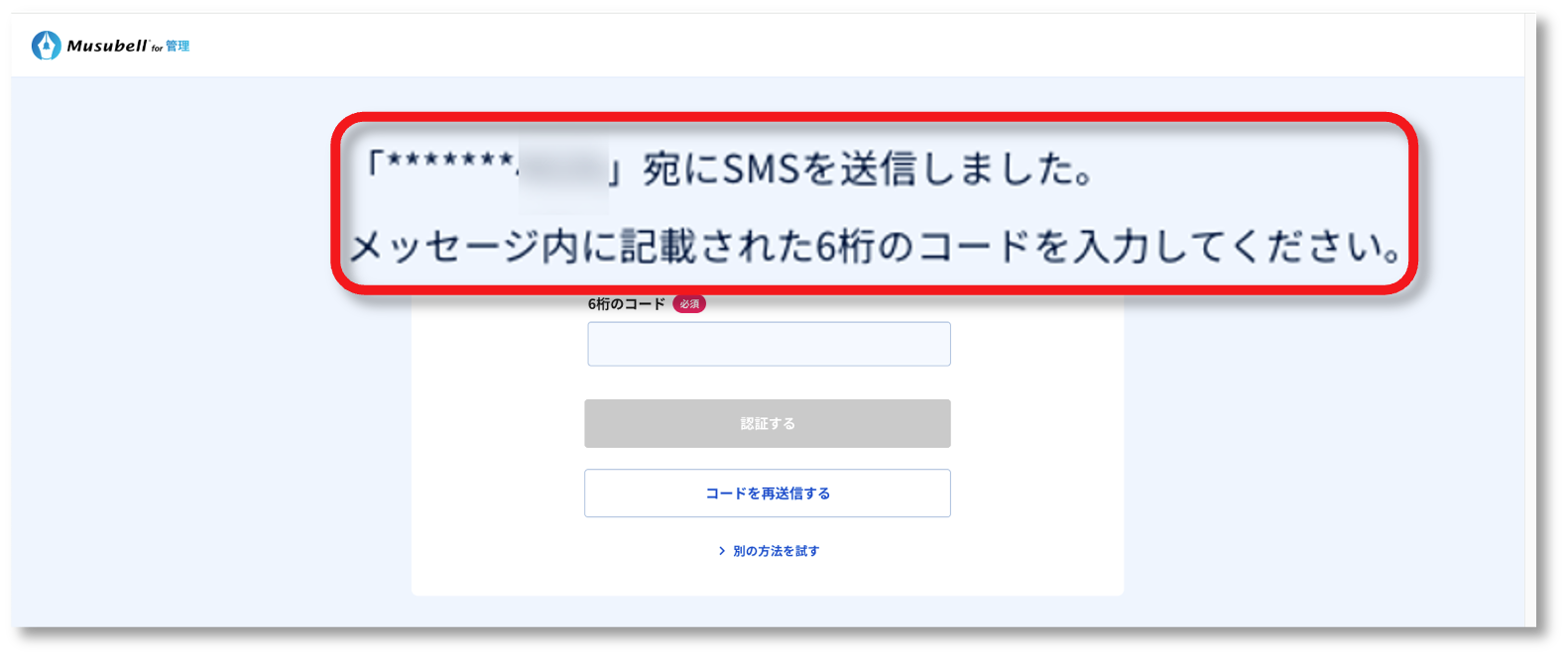 ③「SMSを送信しました」というメッセージが表示されたら、 スマホのSMSに届いた、6桁のコードを確認します。