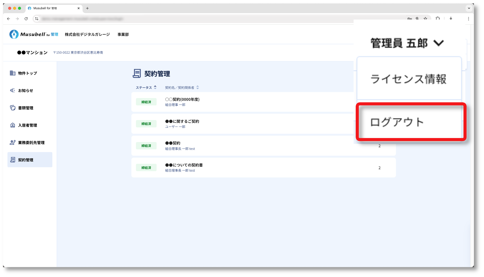 ①画面右上のアカウント名をクリックし、[ログアウト]を押します。
