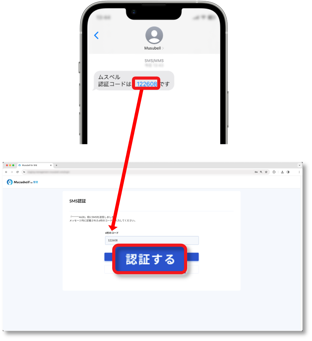②スマホのSMSに認証コードが届きます。 [6桁のコード]欄に認証コードを入力し、[認証する]を押します。