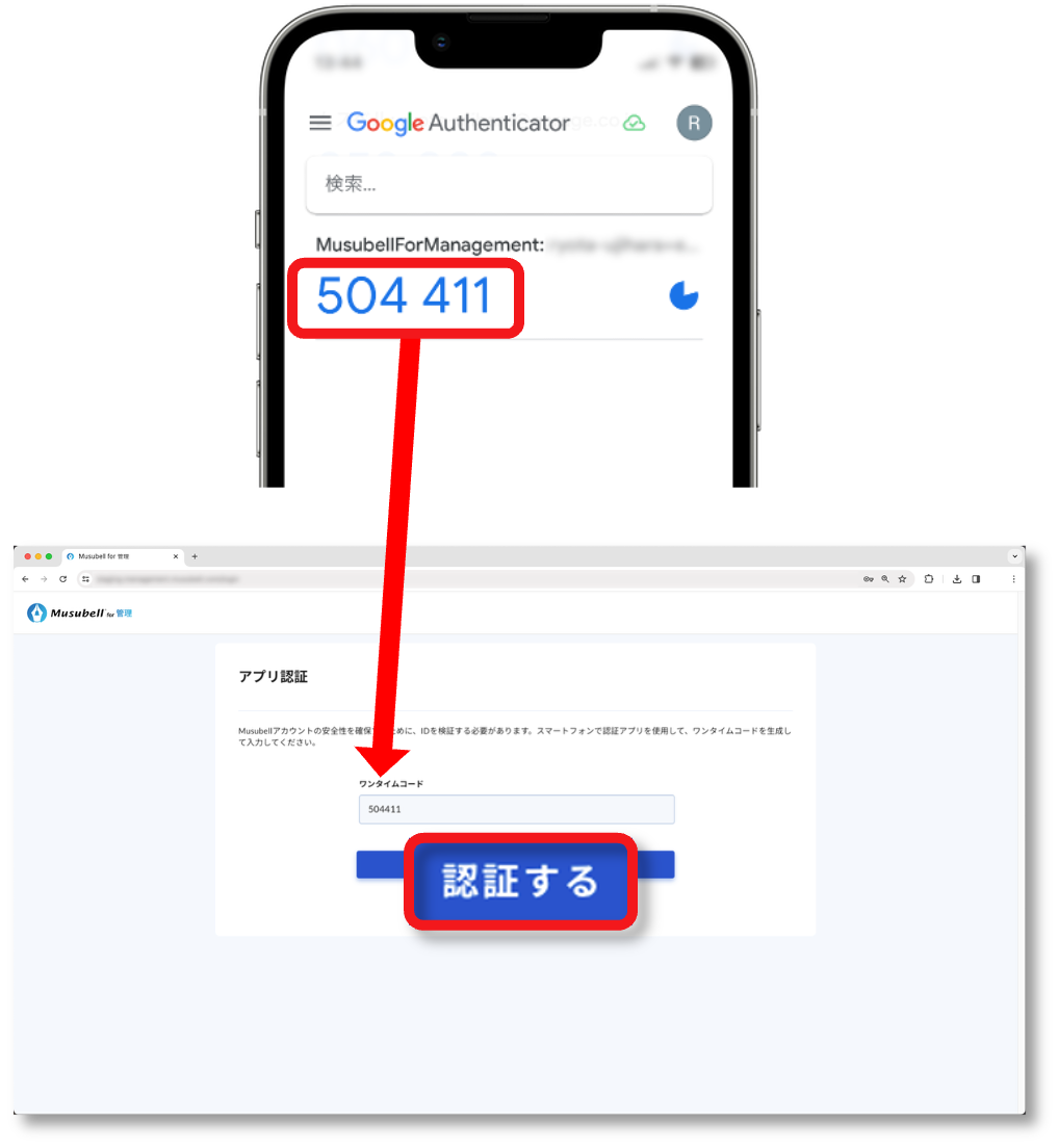 ②スマホの認証アプリに表示されている6桁のコードを、 [ワンタイムコード]欄に入力して、[認証する]を押します。